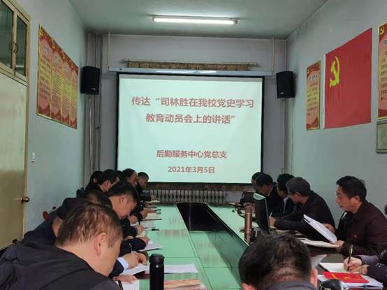 2021年3月5日下午后勤服务中心党总支组织全体职工在11号楼116会议室集中学习《司林胜在我校党史学习教育动员会上的讲话》精神,会议由党总支书记贾永主持。