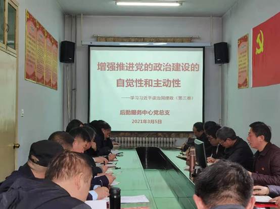 3月5日下午,后勤服务中心党总支组织全体党员在11号楼116会议室,集中学习习近平谈治国理政(第三卷)《增强推进党的政治建设的自觉性和主动性》,会议由党总支书记贾永主持。