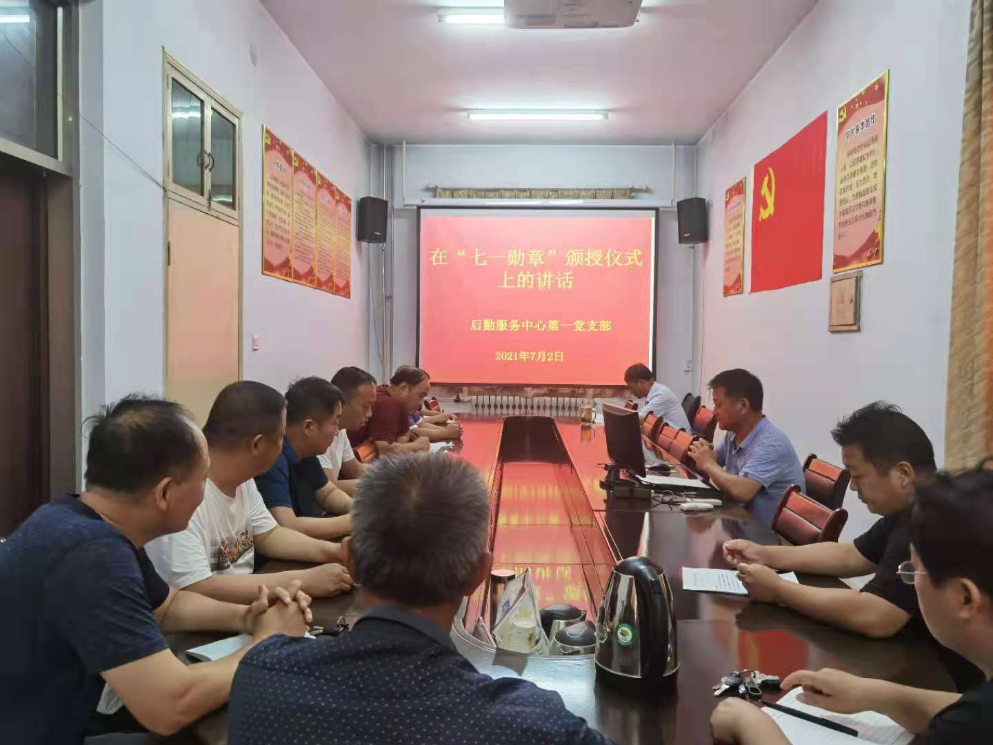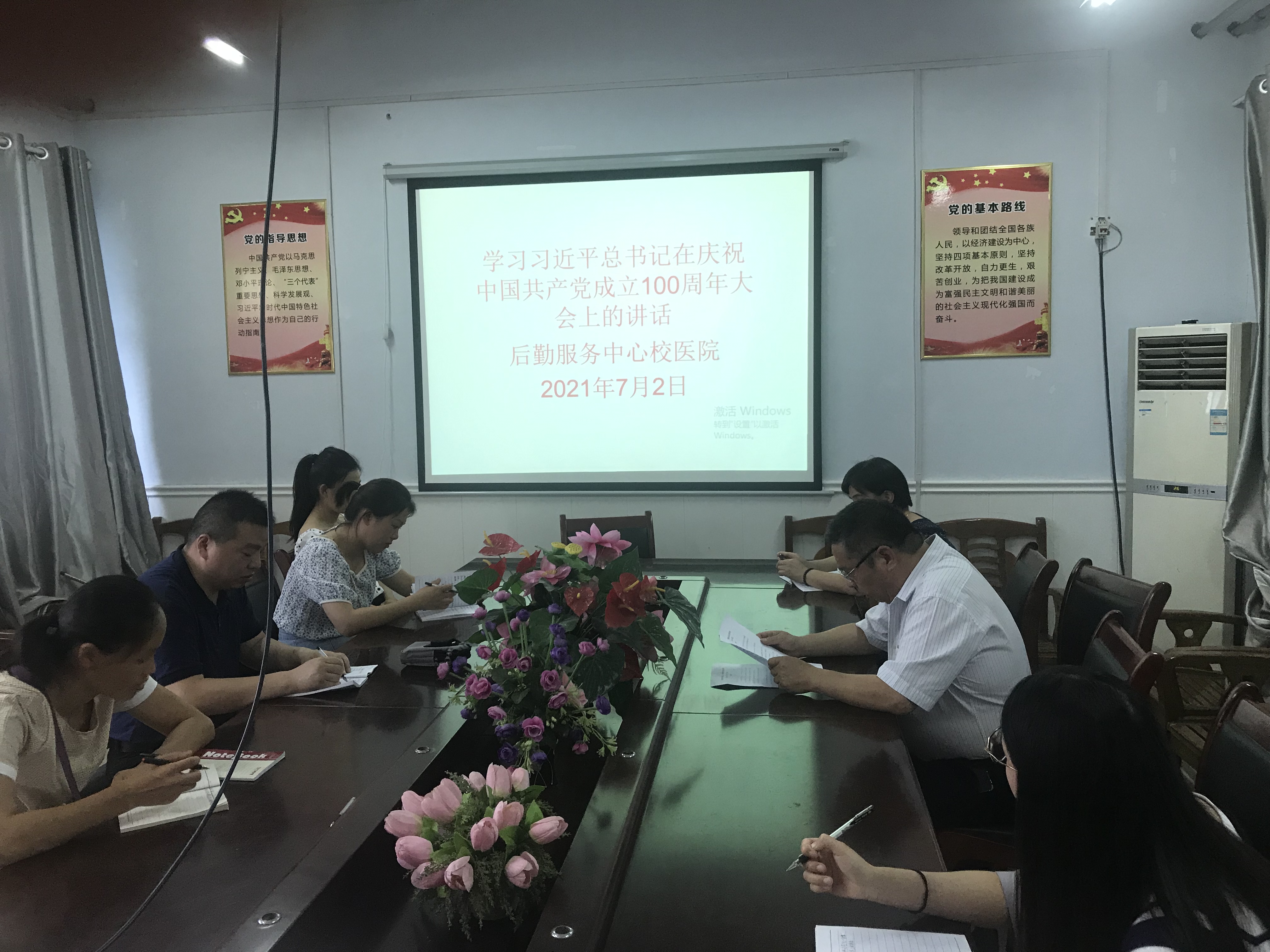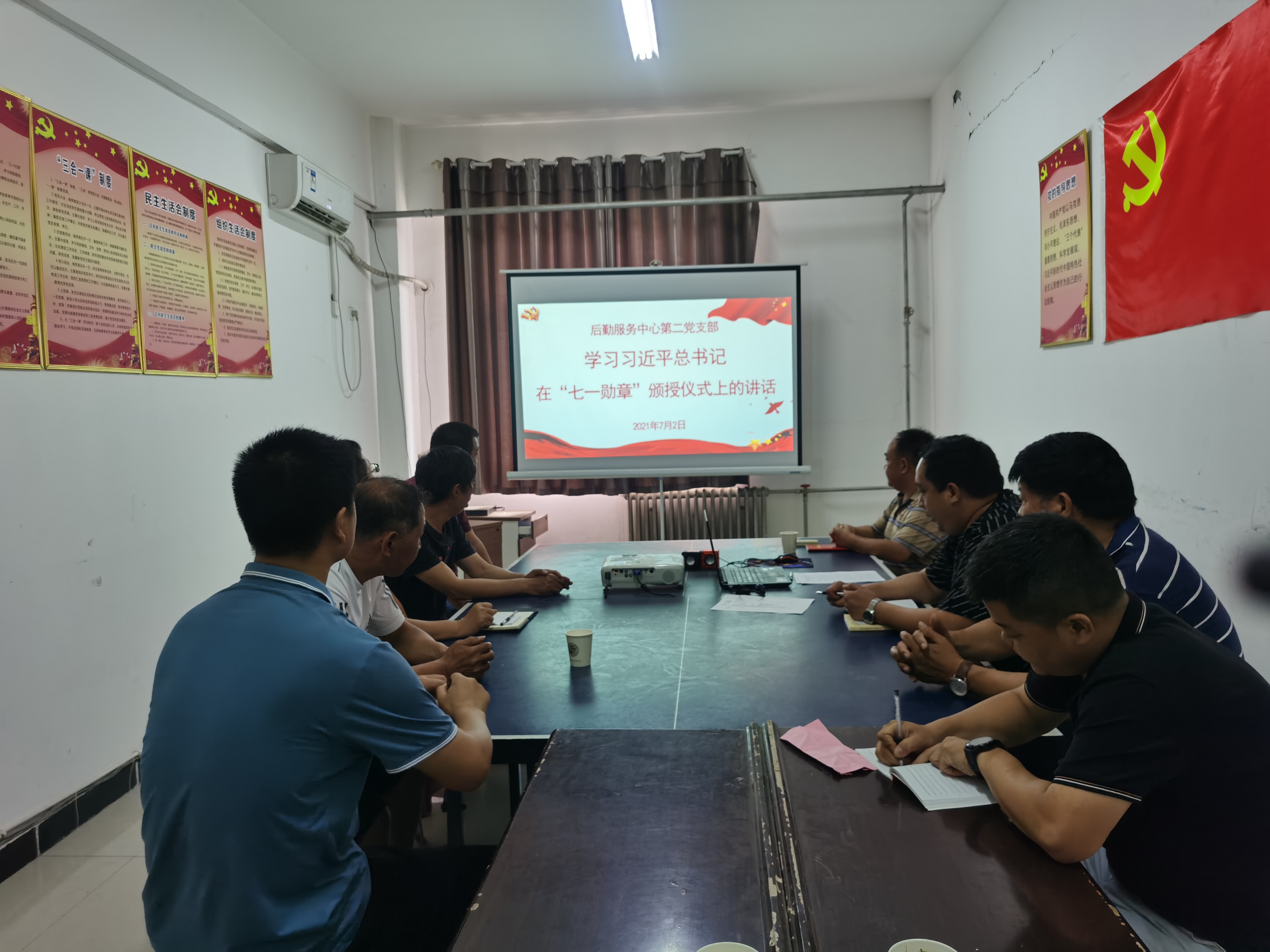 7月2日下午,后勤服务中心各支部书记组织本支部全体职工分别在11号楼116会议室、伙食科会议室、校医院会议室开展集中学习习近平总书记在庆祝中国共产党成立100周年大会上的讲话和在“七一勋章”颁奖仪式上的重要讲话精神,会议由各支部书记主持并领学。